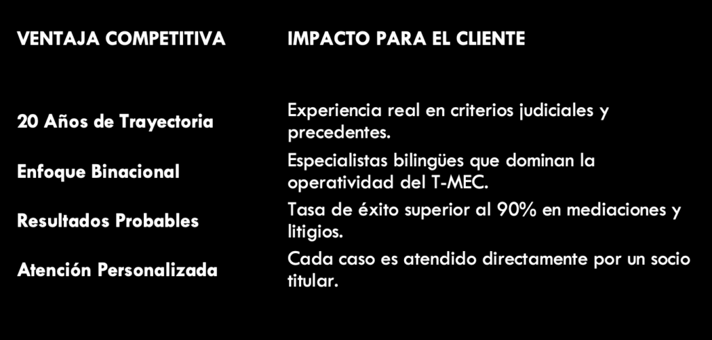 - Expertos en T-MEC: Optimización de reglas de origen, resolución de controversias estado-inversor y cumplimiento normativo transfronterizo.